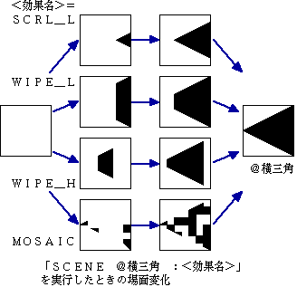 2) SCENE文での表示効果はウィンドウ全体に対して有効ですが、APPEAR文、DISAPPER文では表示を更新する領域(対象のセグメントを囲む長方形)のみ有効となります。