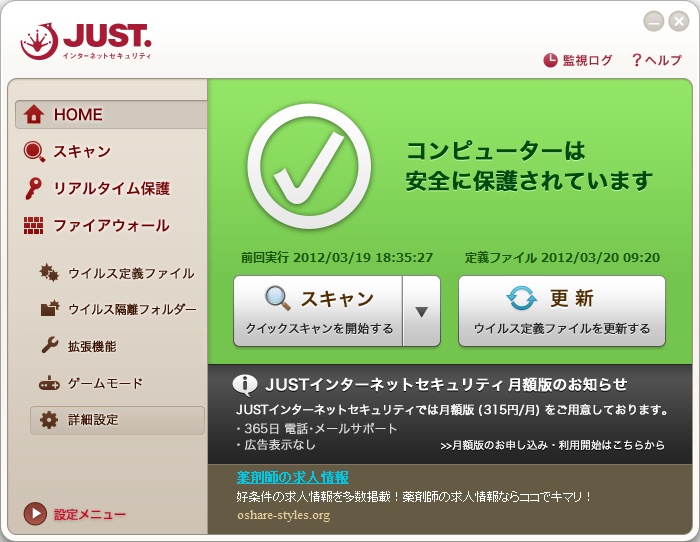 超漢字V:「JUSTインターネットセキュリティ」の設定