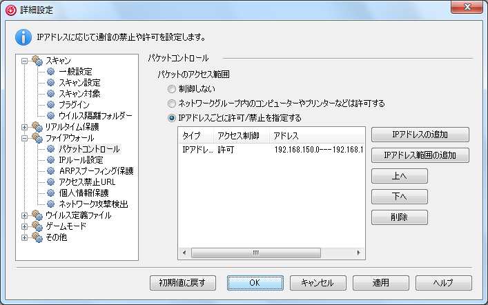 - 左の項目ツリーから「ファイアウォール」の「パケットコントロール」をクリックしてから、「IPアドレスごとに許可/禁止を指定する」にチェックを付け、右の「IPアドレス範囲の追加」をクリックします。