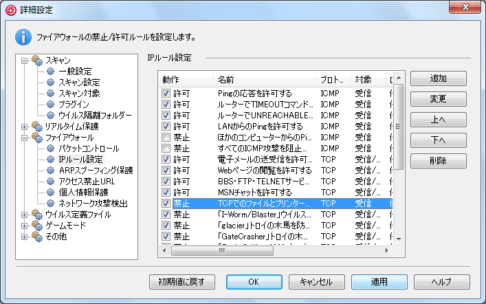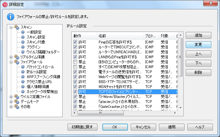 - 左の項目ツリーから「ファイアウォール」の「IPルール設定」をクリックし、ルールの一覧から「許可 TCPでのファイルとプリンターの共有を許可する」を探してクリックし、右端の「変更」をクリックします。