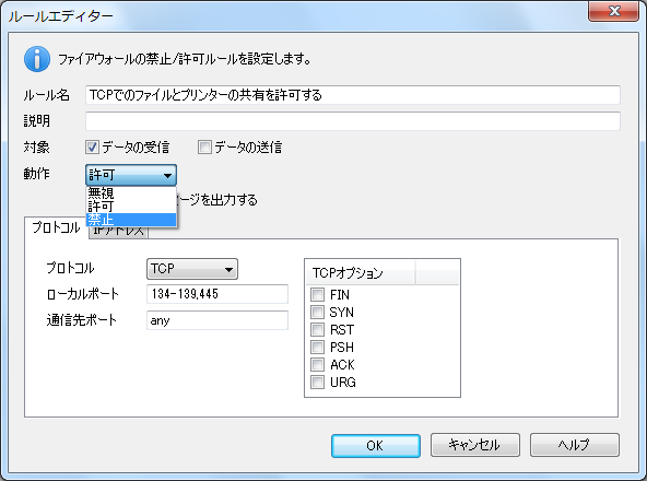 - 「動作」欄を「禁止」に変更します。